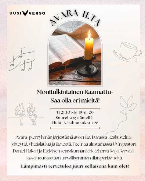 Avara -pienyhteisö järjestää kaikille avoimen Avara -illan 21.10.2025 klo 18-20 Suurella sydämellä -klubilla (Näsilinnankatu 26) . Luvassa on keskustelua, yhteislaulua ja iltateetä. Teemaa alustamassa ovat Eteläisen seurakunnan kirkkoherra Kaija Karvala ja Uuden Verson pastori Daniel Hukari.