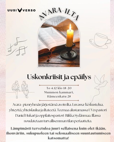 Seuraava Avara-ilta pidetään 4.12. Mummon Kammarissa klo 18-20. Teemana illassa on uskonkriisit ja epäily, aiheesta keskustelemassa Daniel Hukari Uudelta Versolta ja oppilaitospappi Riikka Sydänmaa. Tervetuloa mukaan! Voit myös kysyä Danielilta lisää.